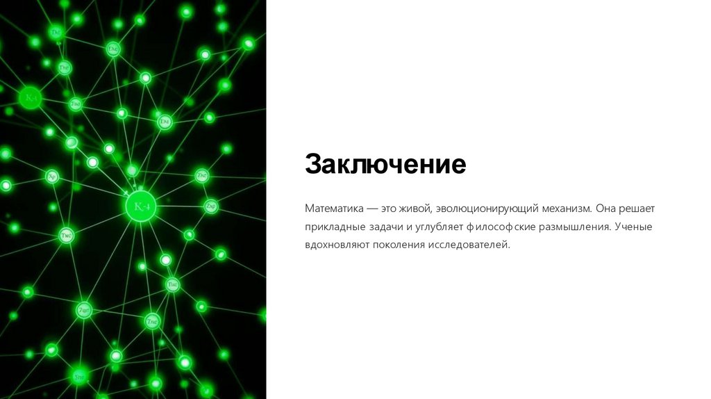 ЗаключениеМатематика — это живой, эволюционирующий механизм. Она решает