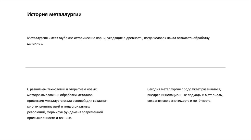 История металлургииМеталлургия имеет глубокие исторические корни, уходящие в древность, когда человек начал осваивать обработку
