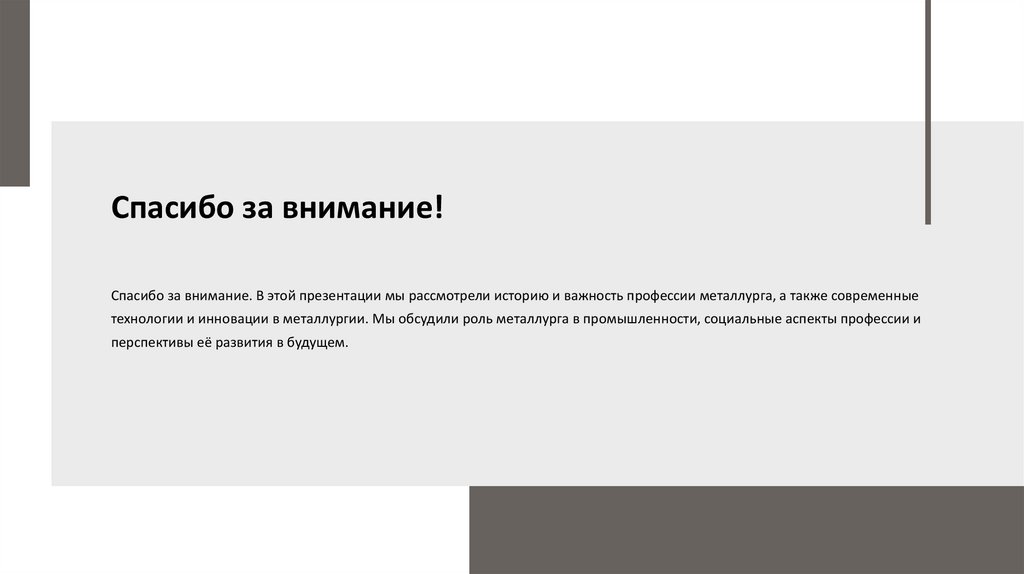 Спасибо за внимание!Спасибо за внимание. В этой презентации мы рассмотрели историю и важность профессии металлурга, а также современные