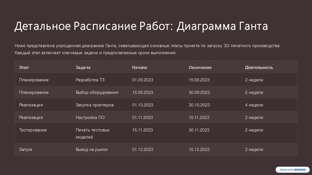 Детальное Распис ание Работ: Диаграмма ГантаНиже представлена упрощенная диаграмма Ганта, охватывающая основные этапы проекта по запуску 3D-печатного производства.