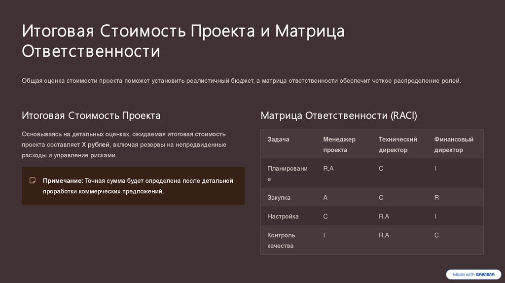 Общая оценка стоимости проекта поможет установить реалистичный бюджет, а матрица ответственности обеспечит четкое распределение ролей.