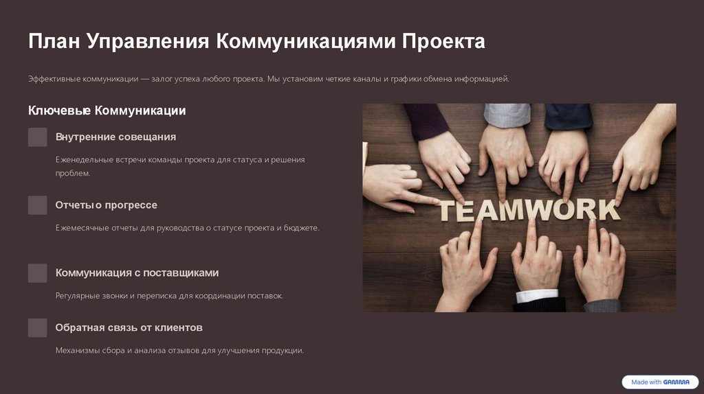 План Управления Коммуникациями ПроектаЭффективные коммуникации — залог успеха любого проекта. Мы установим четкие каналы и графики обмена информацией.