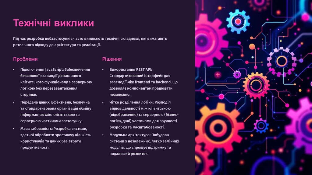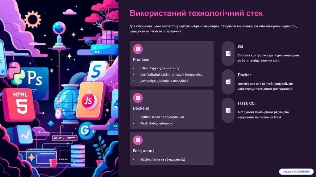 Використаний технологічний стекДля створення цього вебзастосунку було обрано перевірені та сучасні технології, які забезпечують надійність,