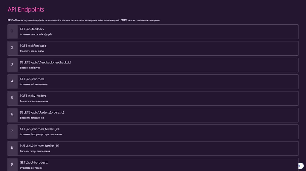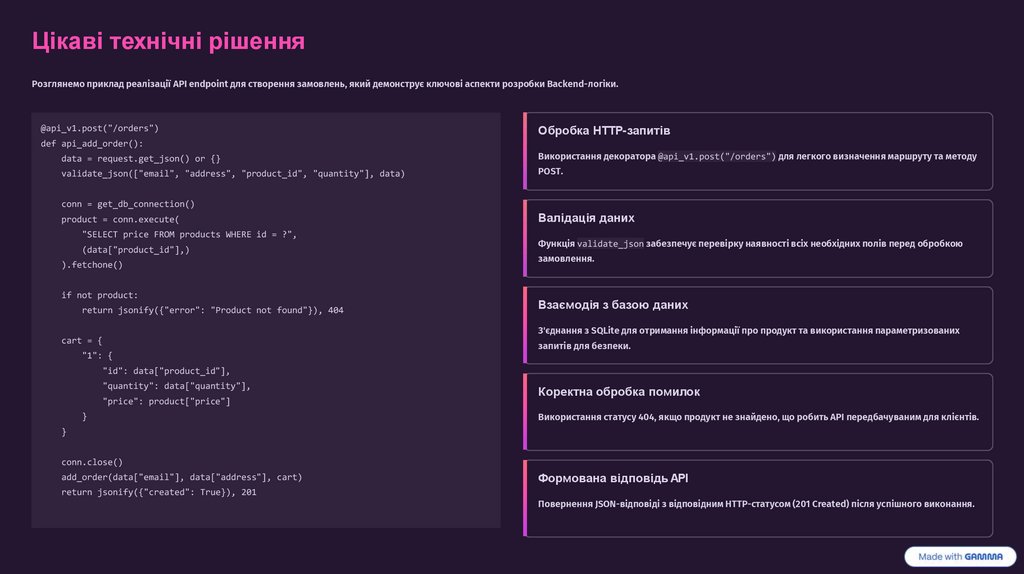 Цікаві технічні рішенняРозглянемо приклад реалізації API endpoint для створення замовлень, який демонструє ключові аспекти розробки Backend-логіки.