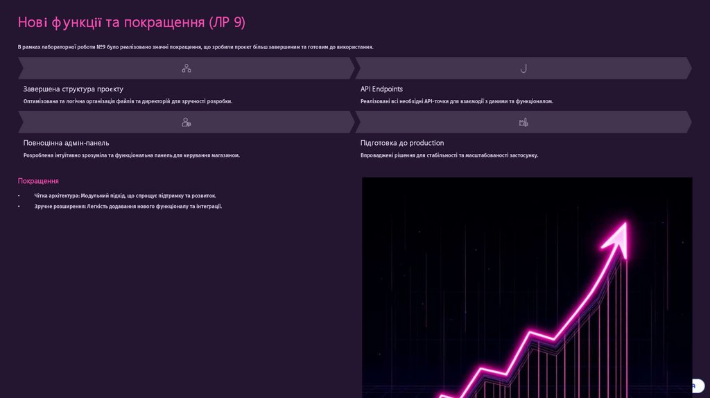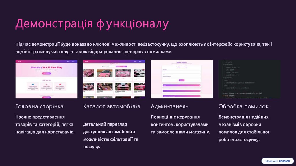 Демонстрація ф ункціоналуПід час демонстрації буде показано ключові можливості вебзастосунку, що охоплюють як інтерфейс користувача, так і