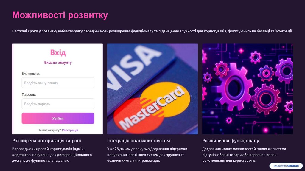 Можливості розвиткуНаступні кроки у розвитку вебзастосунку передбачають розширення функціоналу та підвищення зручності для користувачів, фокусуючись на безпеці та інтеграції.