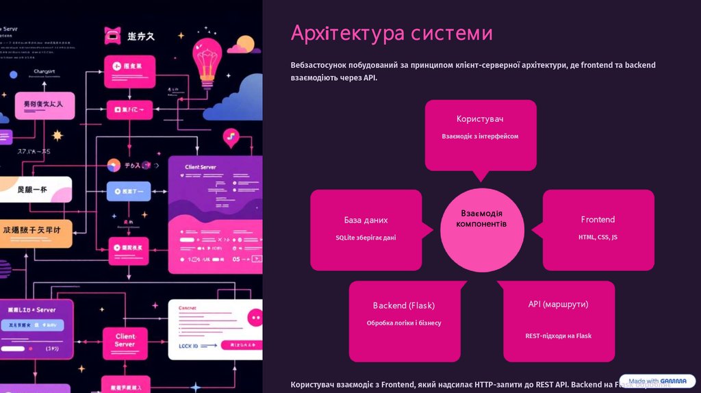 Архітект ура системиВебзастосунок побудований за принципом клієнт-серверної архітектури, де frontend та backend