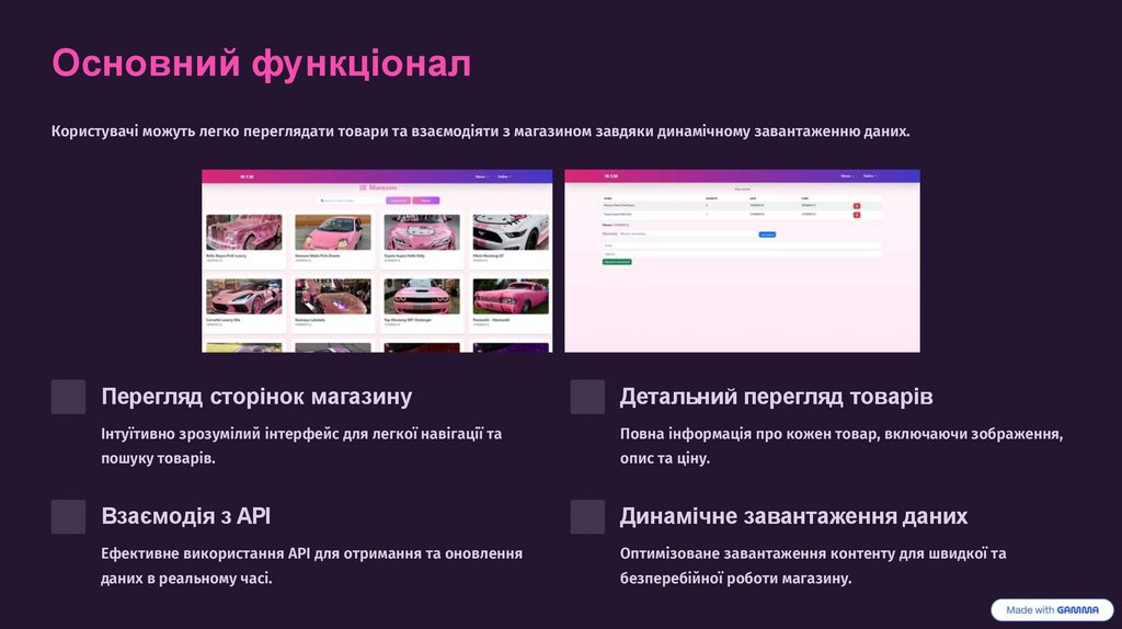 Основний функціоналКористувачі можуть легко переглядати товари та взаємодіяти з магазином завдяки динамічному завантаженню даних.