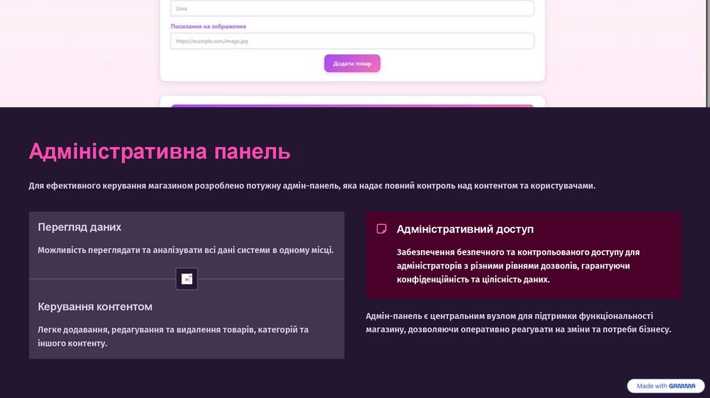 Адміністративна панельДля ефективного керування магазином розроблено потужну адмін-панель, яка надає повний контроль над контентом та користувачами.