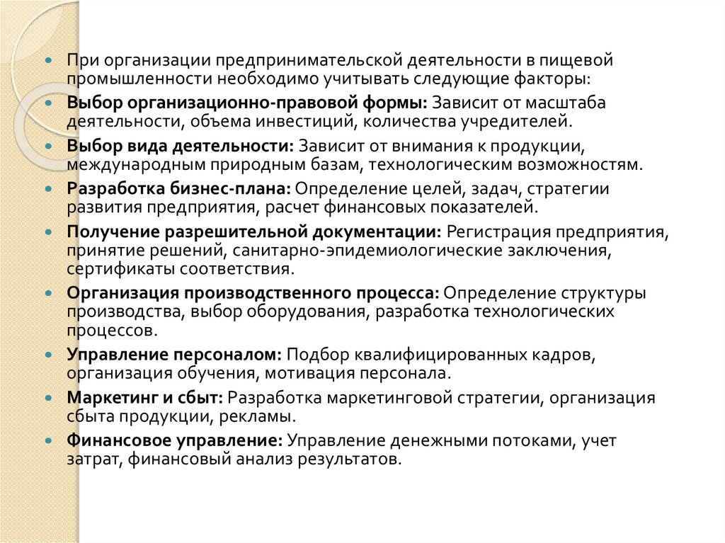 При организации предпринимательской деятельности в пищевойпромышленности необходимо учитывать следующие факторы: