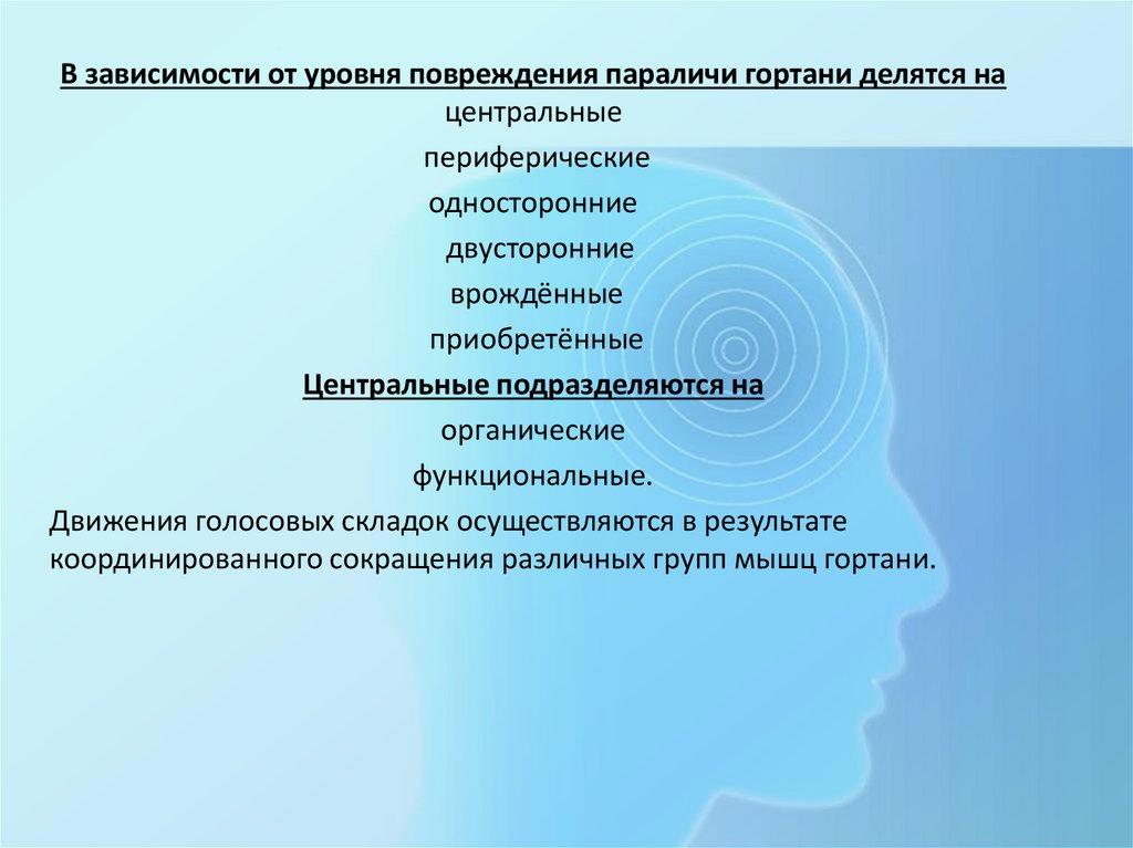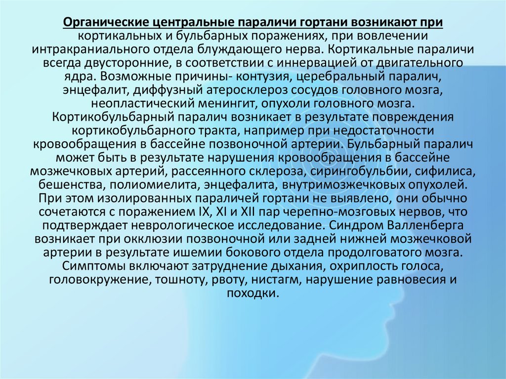 Органические центральные параличи гортани возникают прикортикальных и бульбарных поражениях, при вовлечении