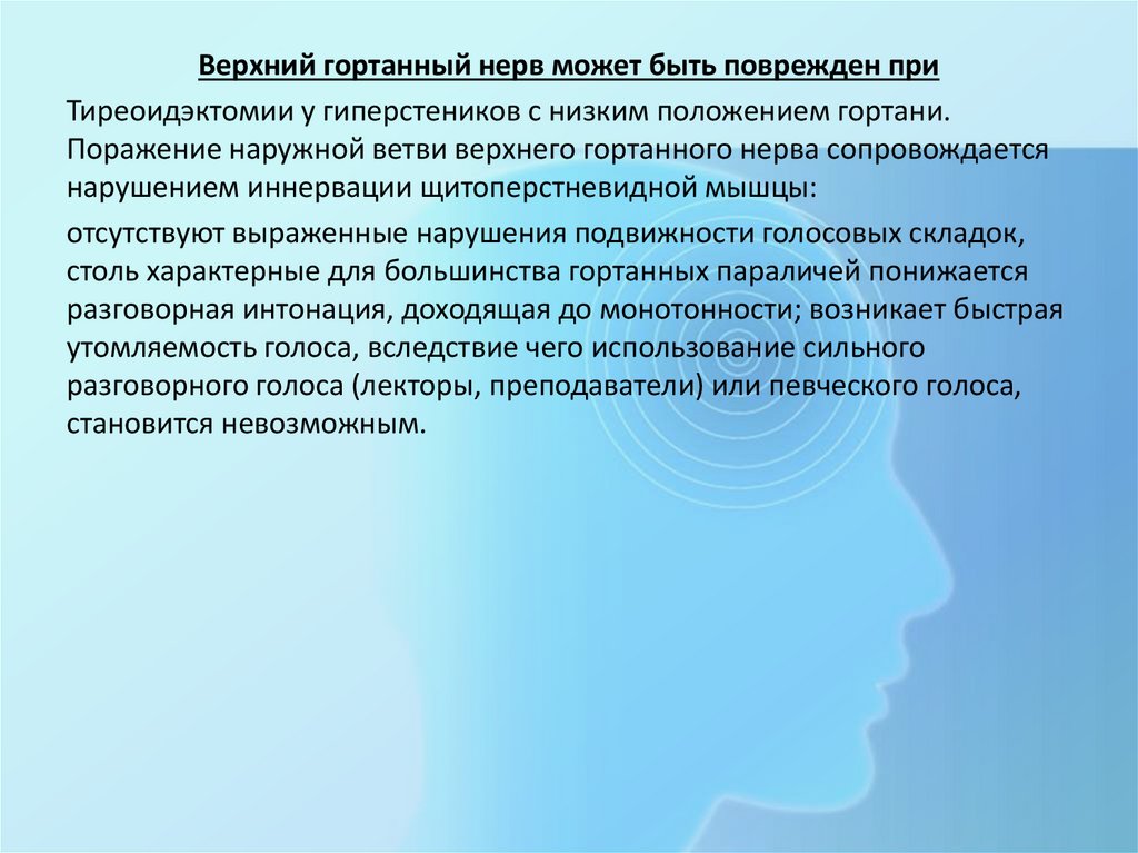 повреждение нижнего гортанного нерва или, реже, верхнего гортанного