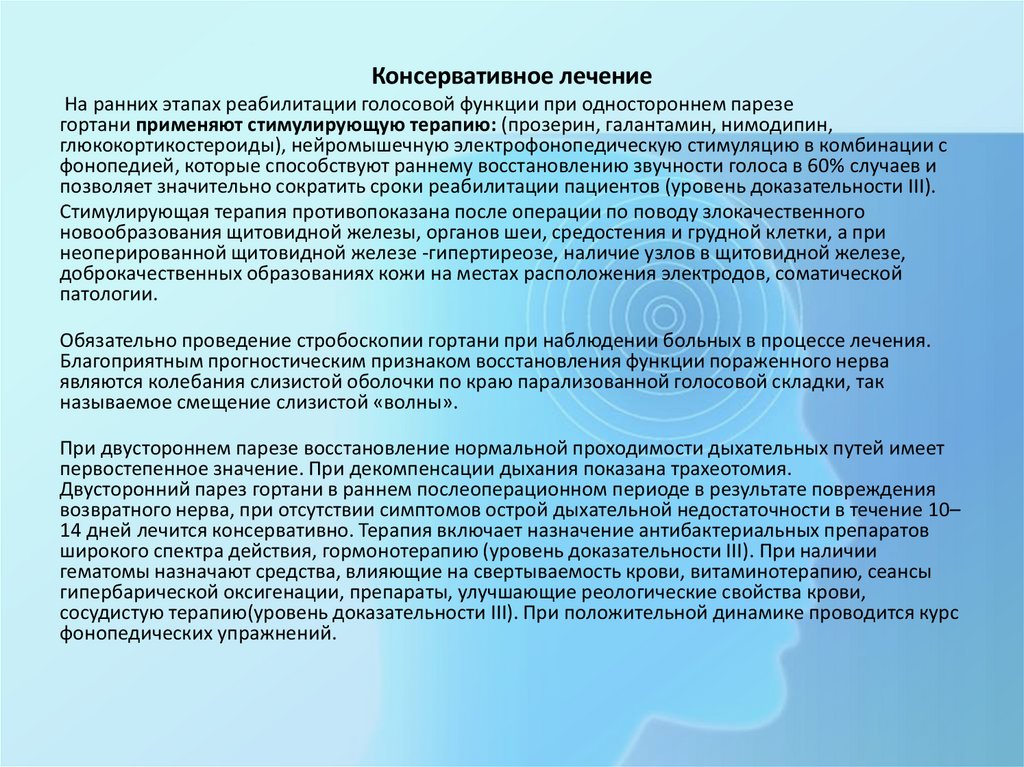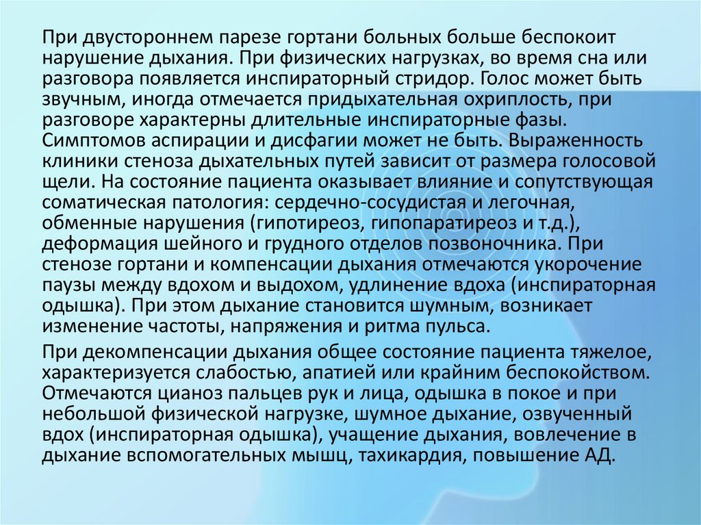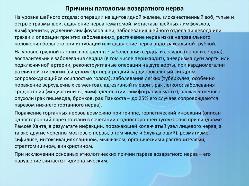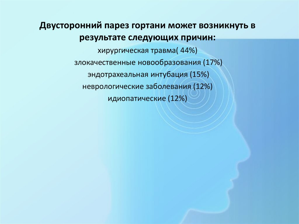 Двусторонний парез гортани может возникнуть врезультате следующих причин: