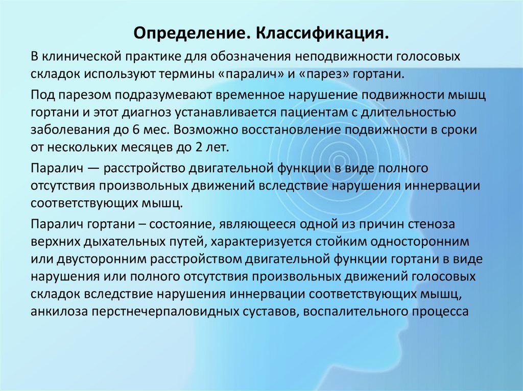 Определение. Классификация.В клинической практике для обозначения неподвижности голосовых
