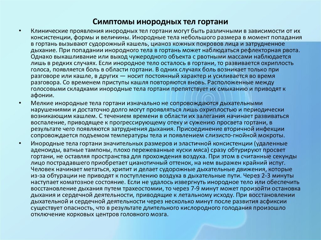 Симптомы инородных тел гортаниКлинические проявления инородных тел гортани могут быть различными в зависимости от их