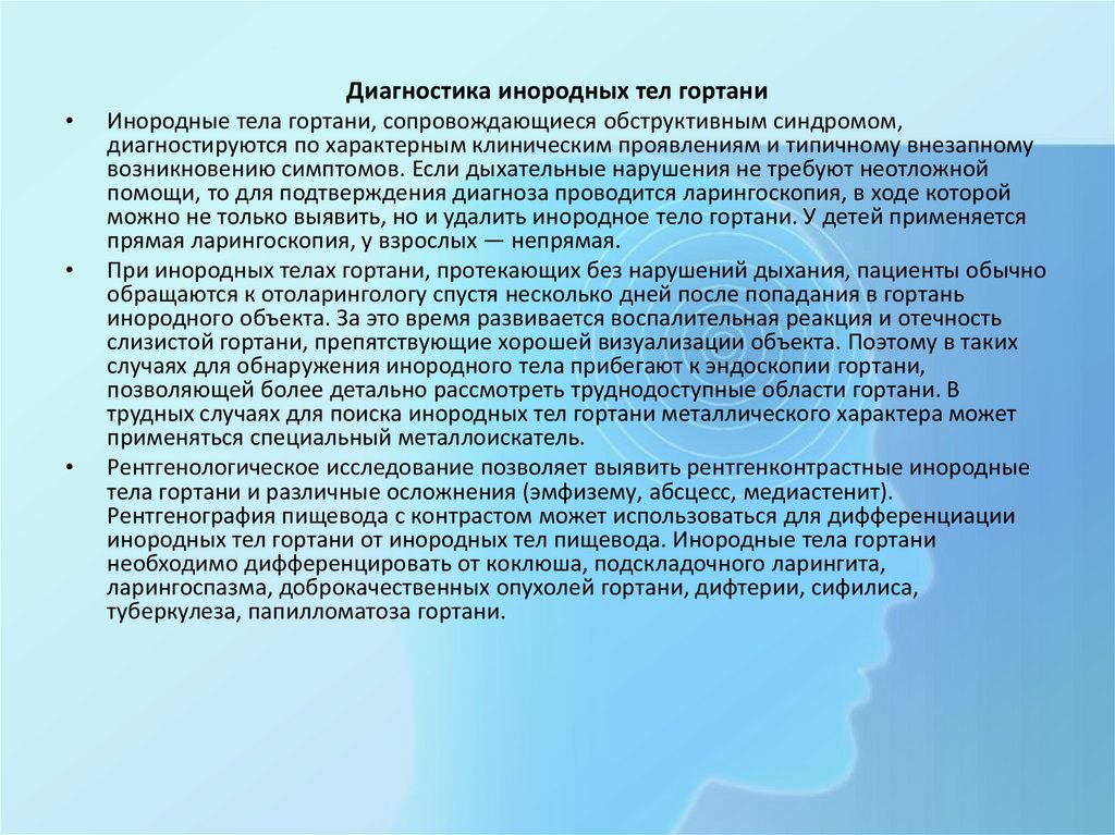 Диагностика инородных тел гортаниИнородные тела гортани, сопровождающиеся обструктивным синдромом,