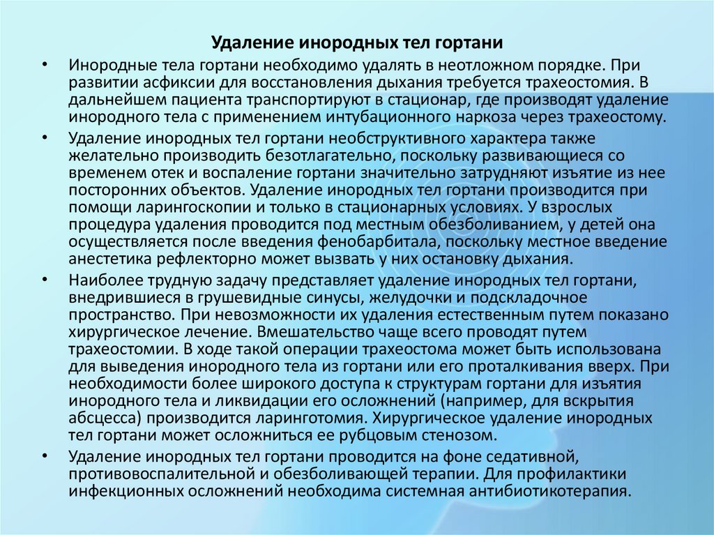 Удаление инородных тел гортаниИнородные тела гортани необходимо удалять в неотложном порядке. При