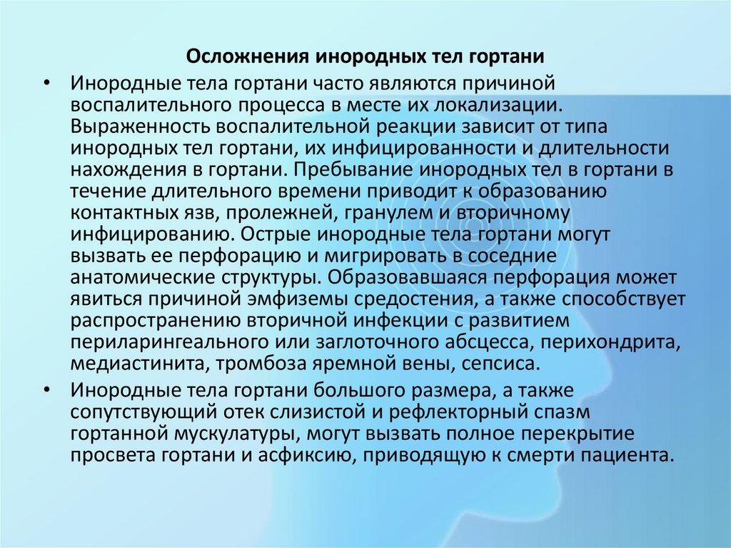 Осложнения инородных тел гортани• Инородные тела гортани часто являются причиной