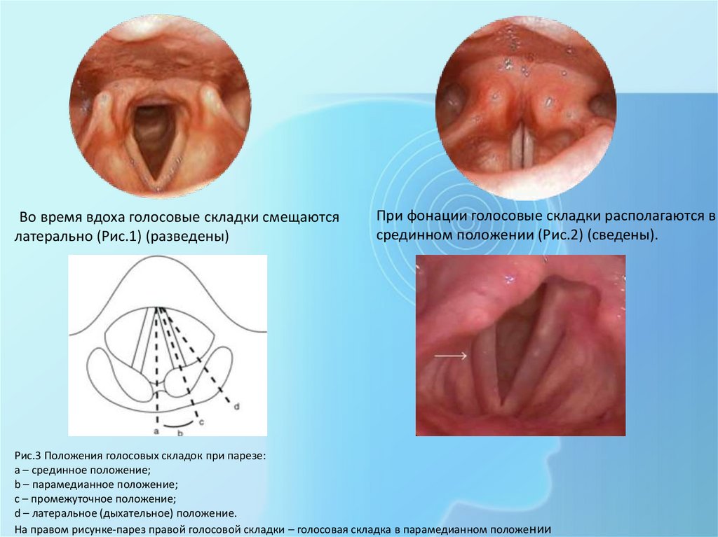 На правом рисунке-парез правой голосовой складки – голосовая складка в парамедианном положении