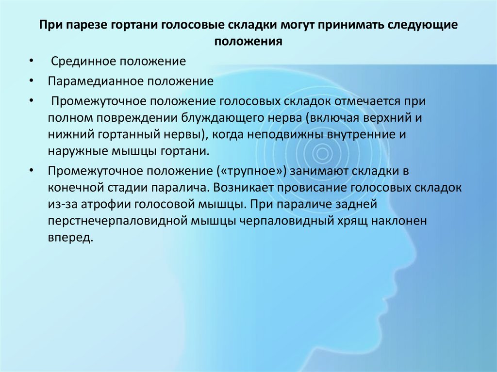 При парезе гортани голосовые складки могут принимать следующиеположения