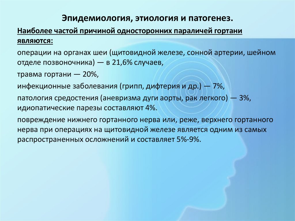 Эпидемиология, этиология и патогенез.Наиболее частой причиной односторонних параличей гортани