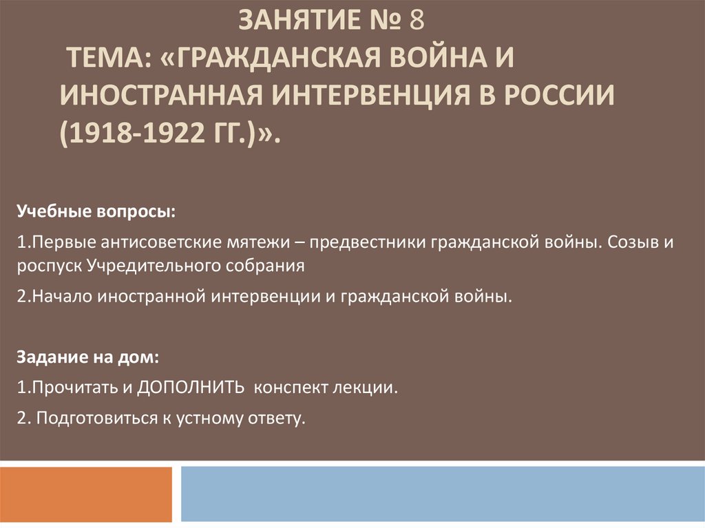 1. Занятие № 8 Тема: «Гражданская война и иностранная интервенция в России (1918-1922 гг.)».