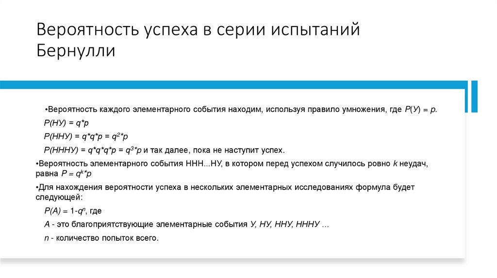 •Вероятность каждого элементарного события находим, используя правило умножения, где P(У) = p.