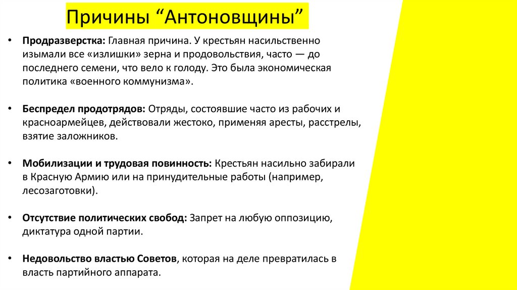 Причины “Антоновщины”• Продразверстка: Главная причина. У крестьян насильственно
