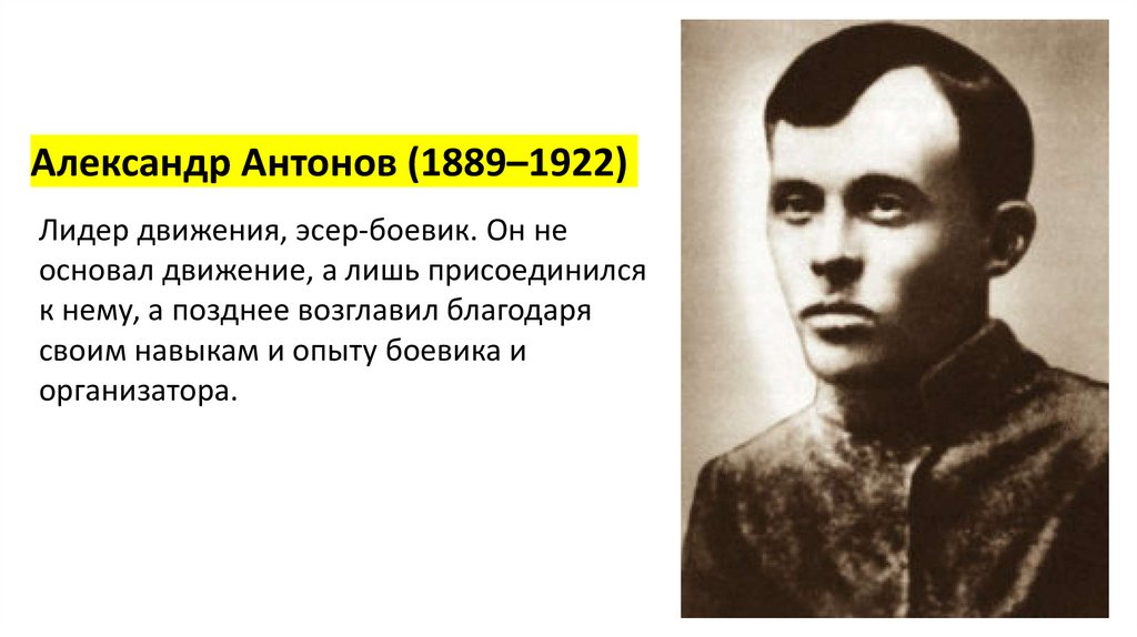 Александр Антонов (1889–1922)Лидер движения, эсер-боевик. Он не