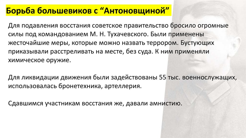 Борьба большевиков с “Антоновщиной”Для подавления восстания советское правительство бросило огромные