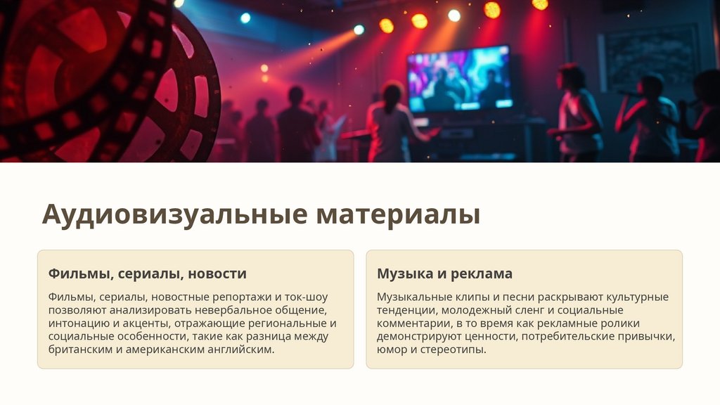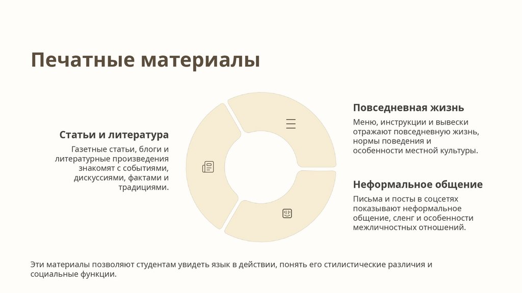 Эти материалы позволяют студентам увидеть язык в действии, понять его стилистические различия и