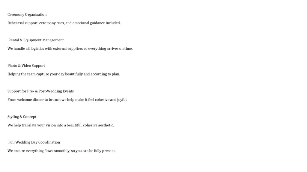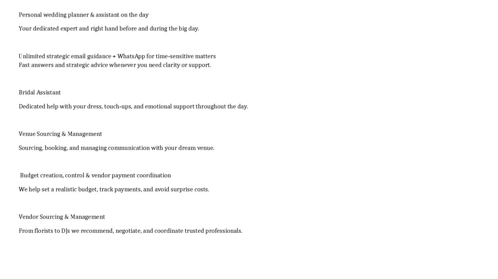Personal wedding planner & assistant on the dayYour dedicated expert and right hand before and during the big day.