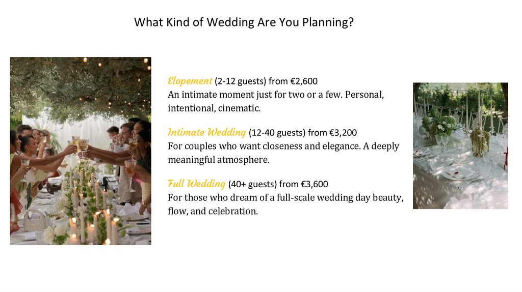 What Kind of Wedding Are You Planning?Elopement (2-12 guests) from €2,600