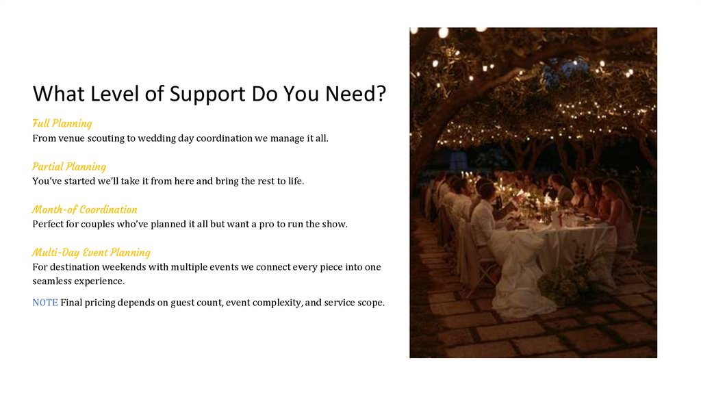 NOTE Final pricing depends on guest count, event complexity, and service scope.