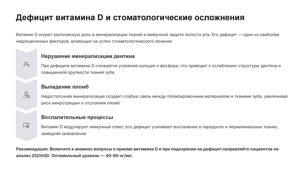 Дефицит витамина D и стоматологические осложненияВитамин D играет критическую роль в минерализации тканей и иммунной защите полости рта. Его дефицит — один из наиболее
