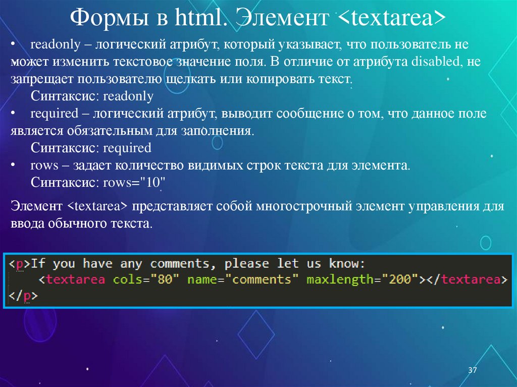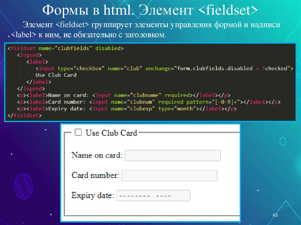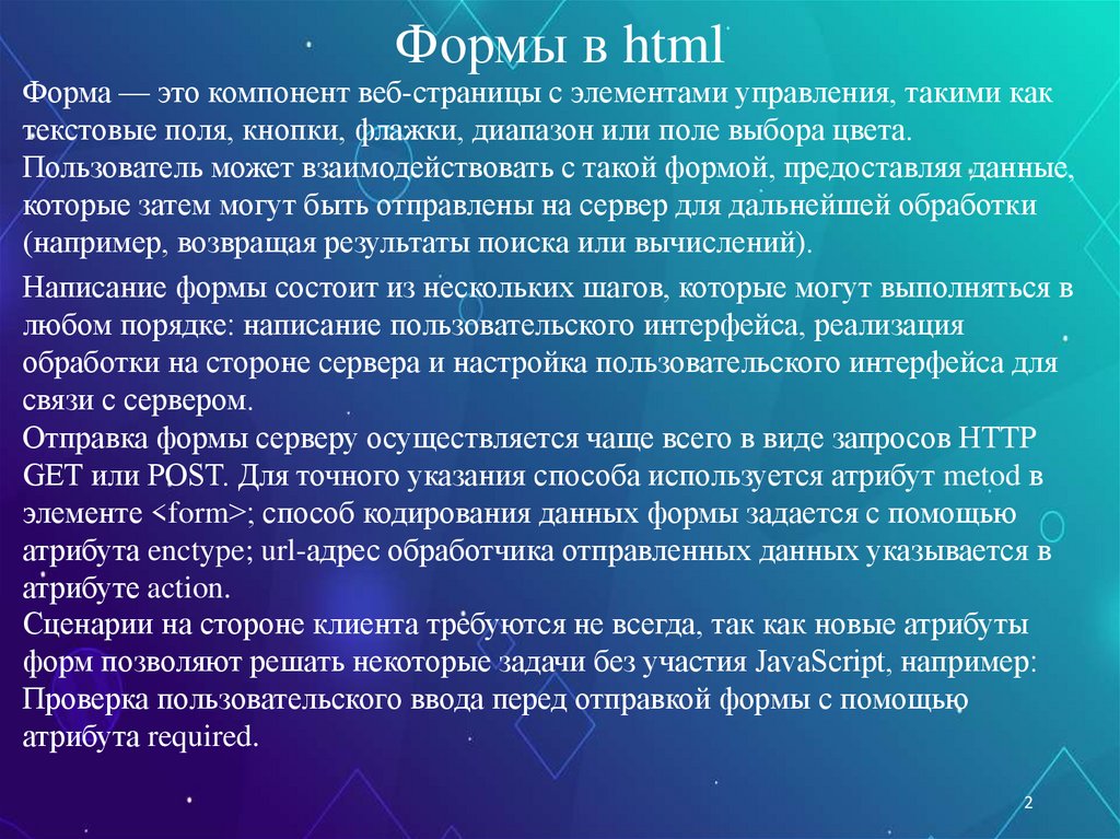 Формы в htmlФорма — это компонент веб-страницы с элементами управления, такими как