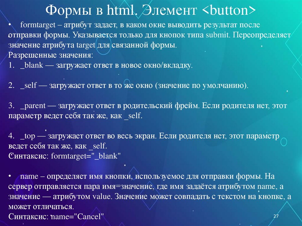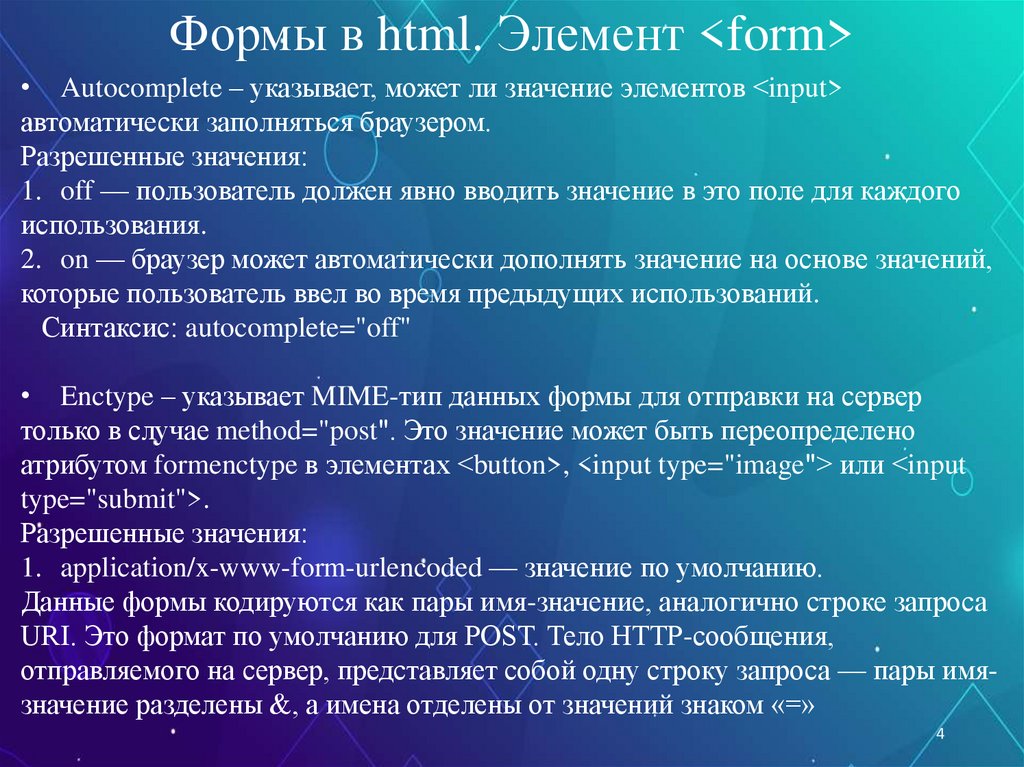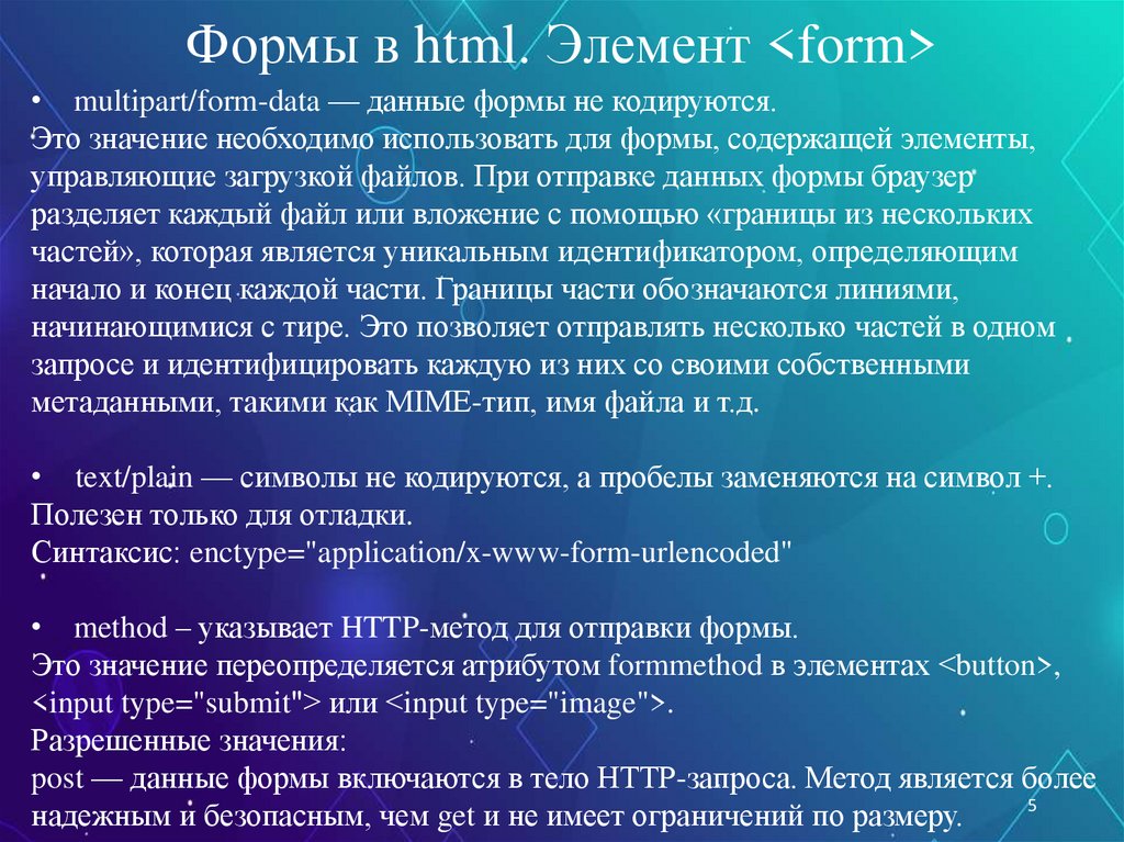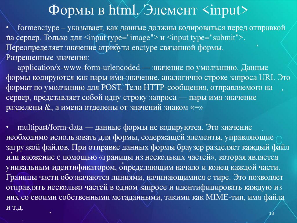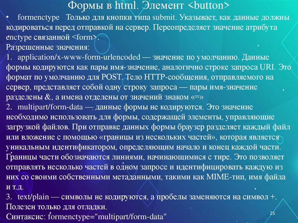 Формы в html. Элемент <form>• multipart/form-data — данные формы не кодируются.