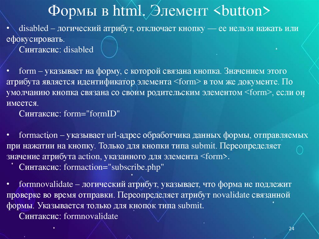 • novalidate – логический атрибут, который указывает, что форма не должна