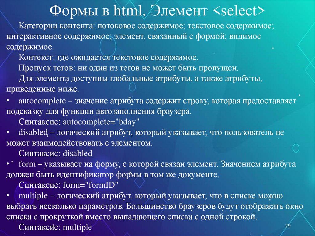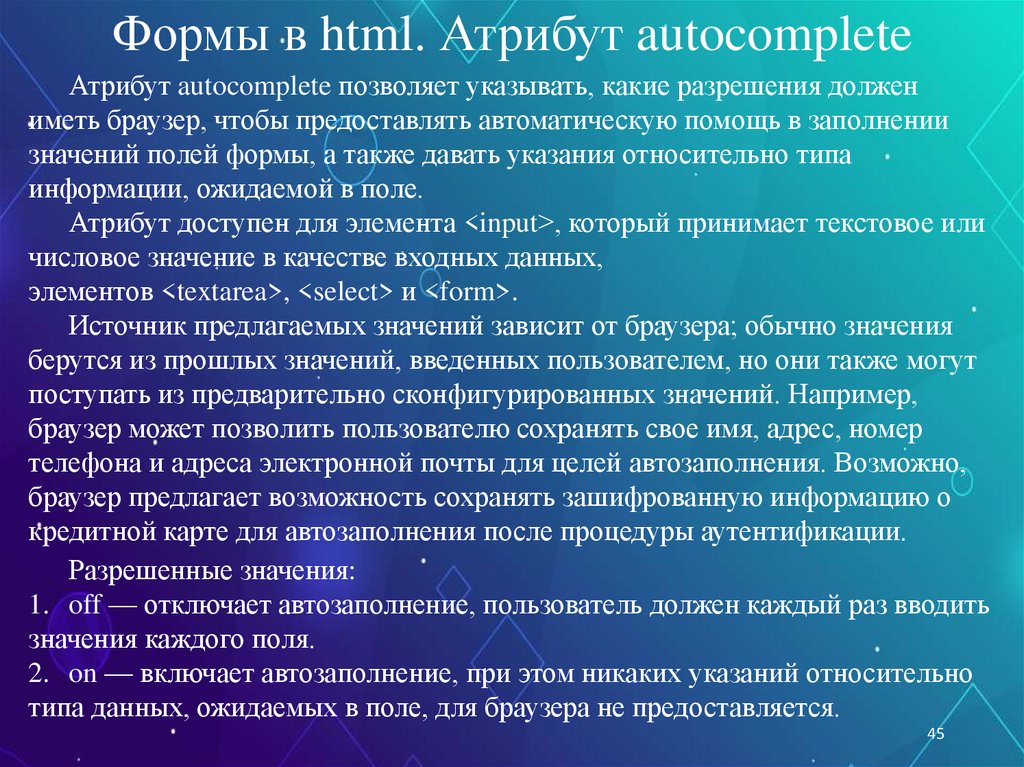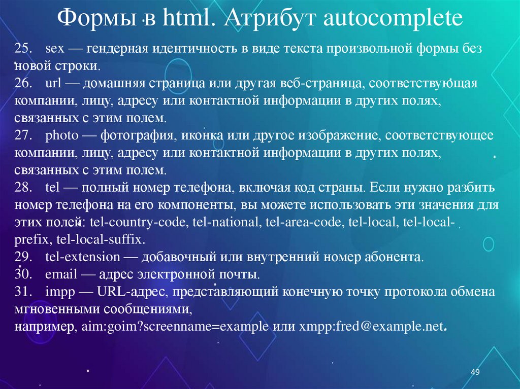 Формы в html. Атрибут autocomplete25. sex — гендерная идентичность в виде текста произвольной формы без