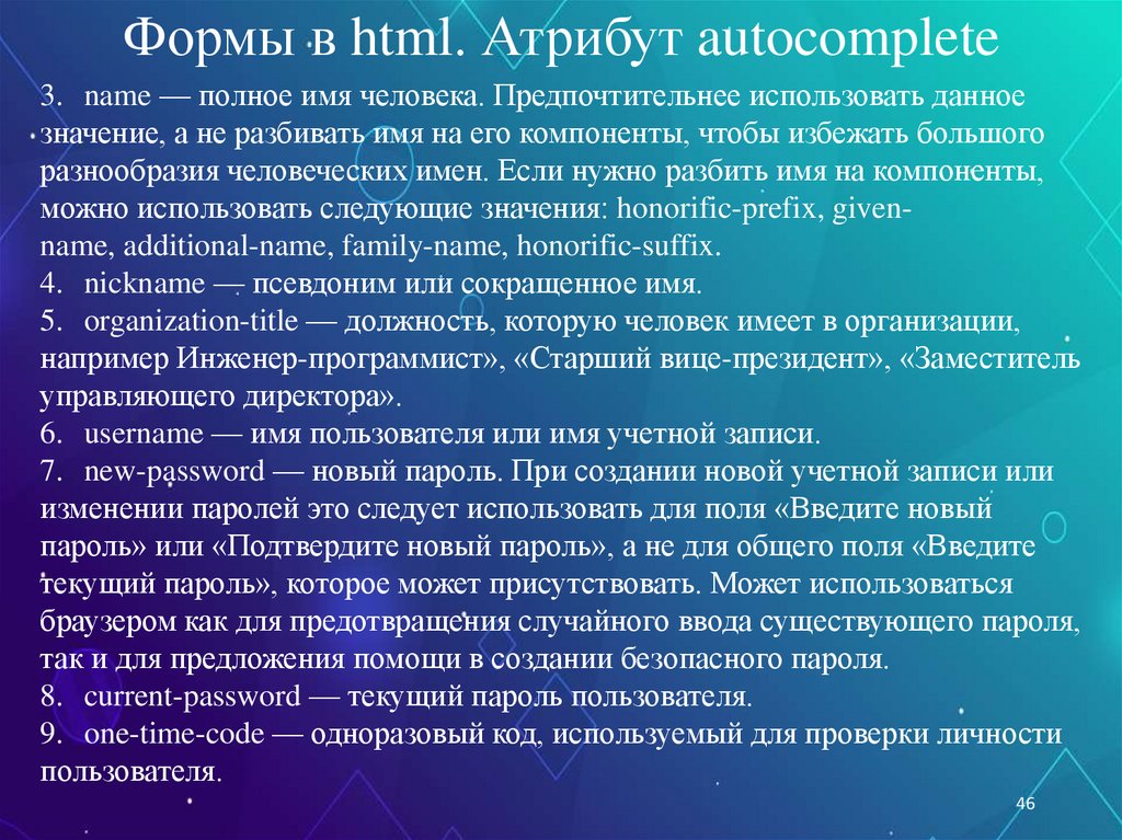 Формы в html. Атрибут autocomplete3. name — полное имя человека. Предпочтительнее использовать данное