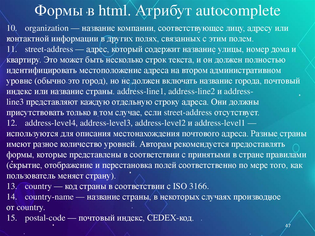 Формы в html. Атрибут autocomplete10. organization — название компании, соответствующее лицу, адресу или