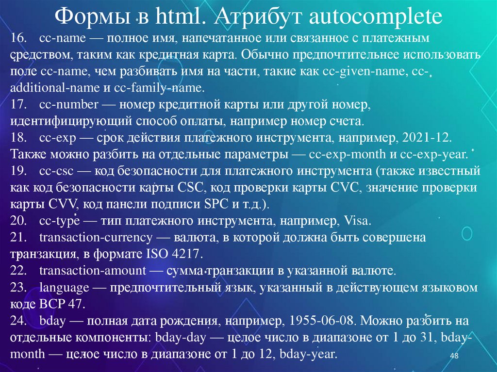 Формы в html. Атрибут autocomplete16. cc-name — полное имя, напечатанное или связанное с платежным