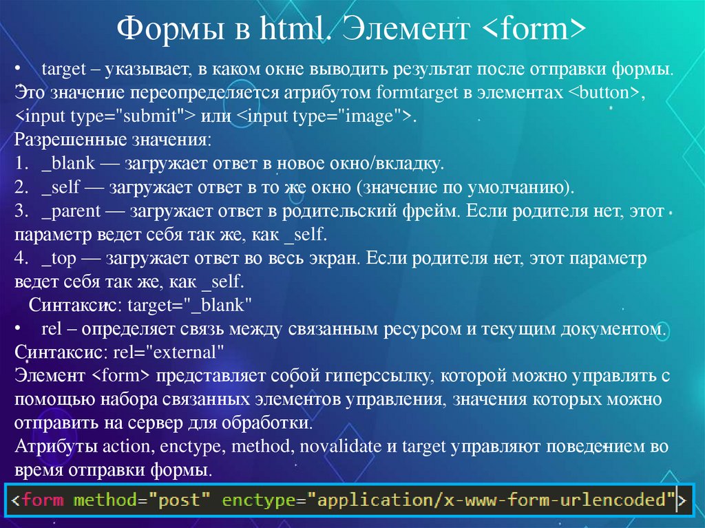 • Enctype – указывает MIME-тип данных формы для отправки на сервер