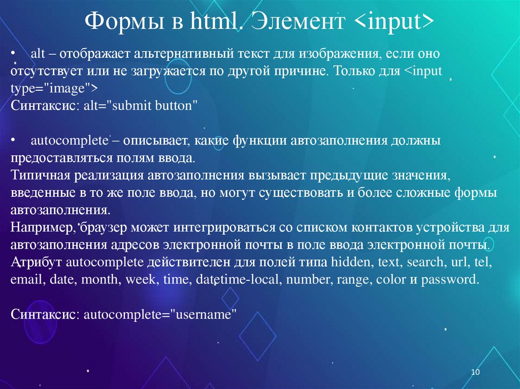 Формы в html. Элемент <form>• Autocomplete – указывает, может ли значение элементов <input>