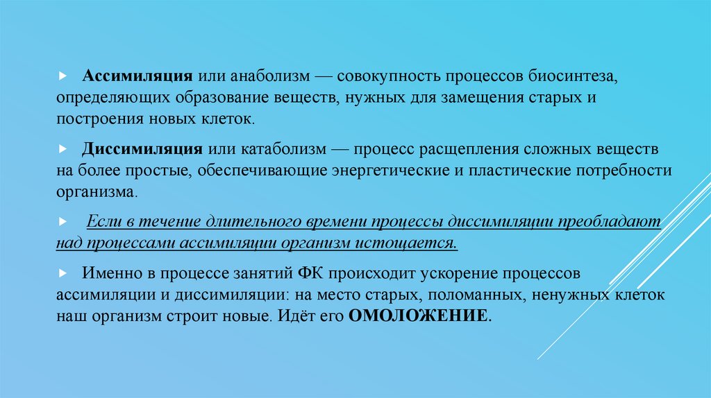 Ассимиляция или анаболизм — совокупность процессов биосинтеза,определяющих образование веществ, нужных для замещения старых и
