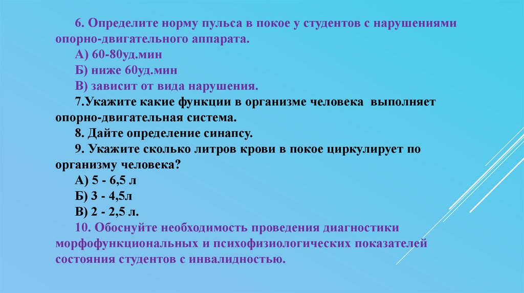 6. Определите норму пульса в покое у студентов с нарушениямиопорно-двигательного аппарата.