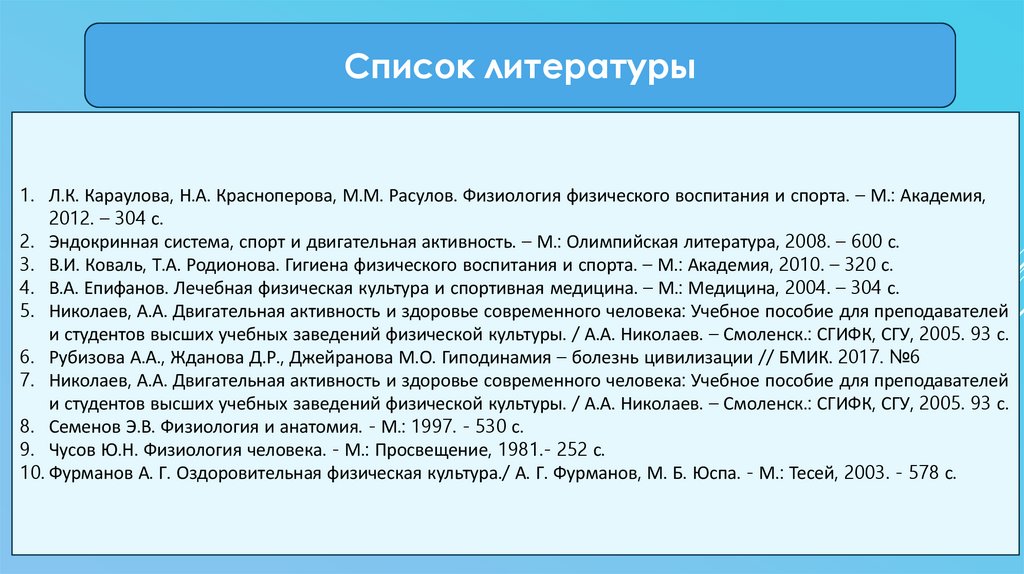 Список литературы1. Л.К. Караулова, Н.А. Красноперова, М.М. Расулов. Физиология физического воспитания и спорта. – М.: Академия,