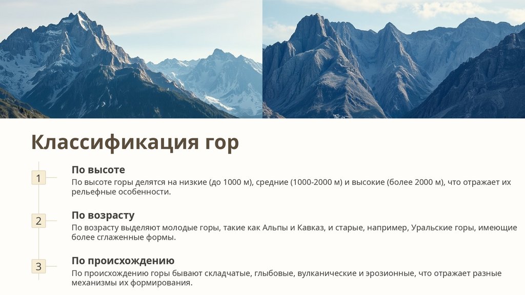 По возрасту выделяют молодые горы, такие как Альпы и Кавказ, и старые, например, Уральские горы, имеющие