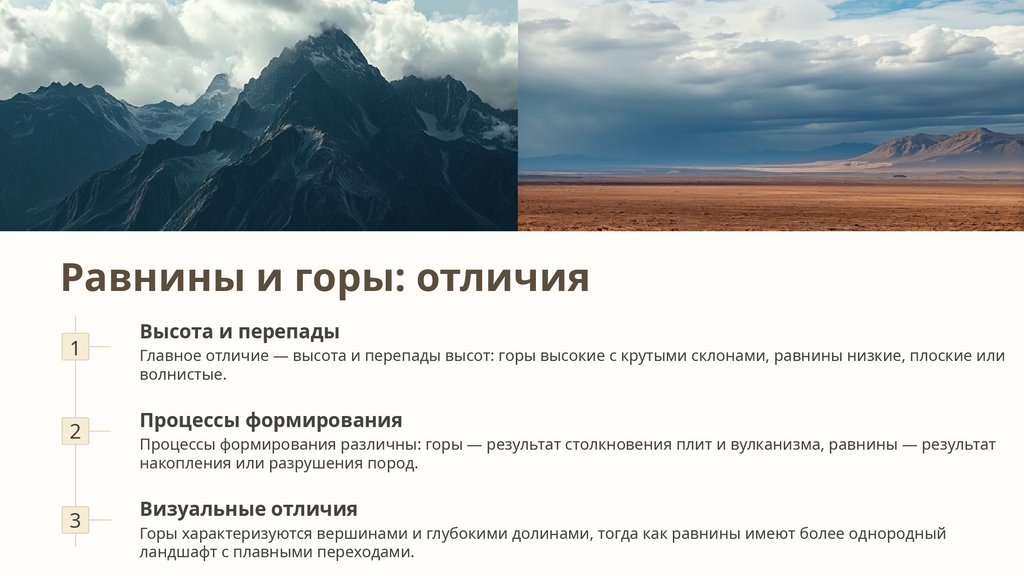 Процессы формирования различны: горы — результат столкновения плит и вулканизма, равнины — результат