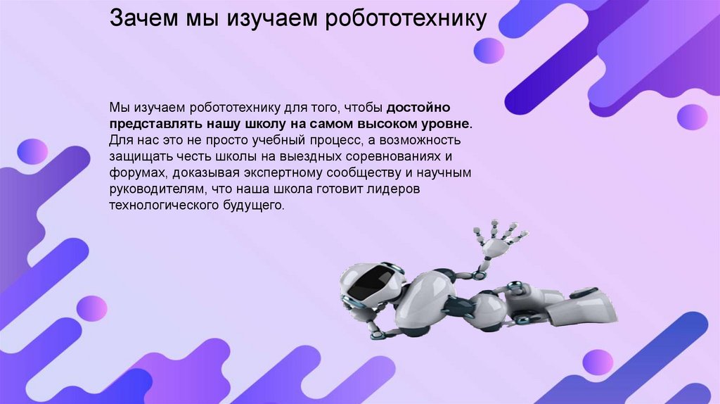 Зачем мы изучаем робототехникуМы изучаем робототехнику для того, чтобы достойно